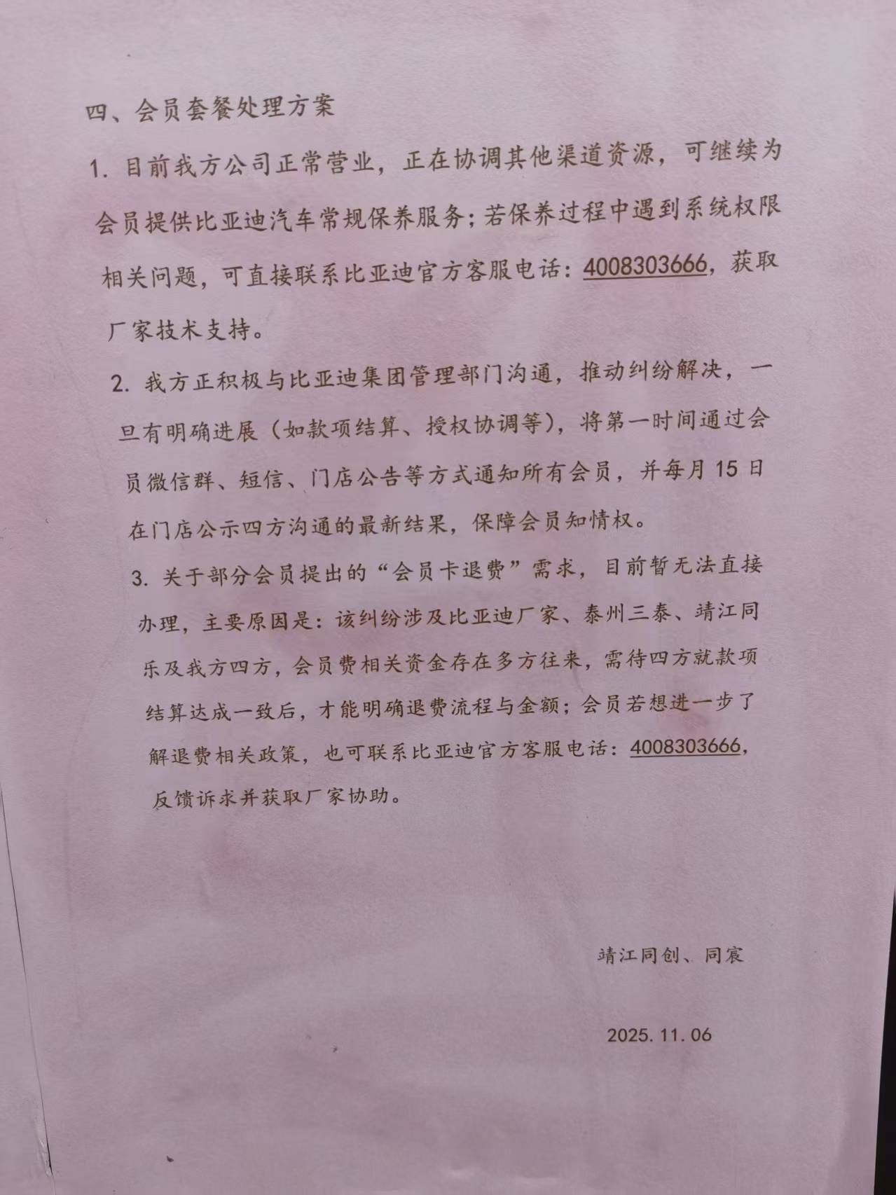 2025年3月份办理了比亚迪电车保养套餐1099元,2025年7月份听说授权有纠纷,这么大的品牌,还能遇到这事,才保养了1次,现在涉事门店(靖江市同创汽车(维修)服务有限公司)贴出这公告,也没给解决方案,真坑啊,还有哪个网友经历过怎么处理的,这个费用就这么不了了之吗😢打12345反映有用吗?