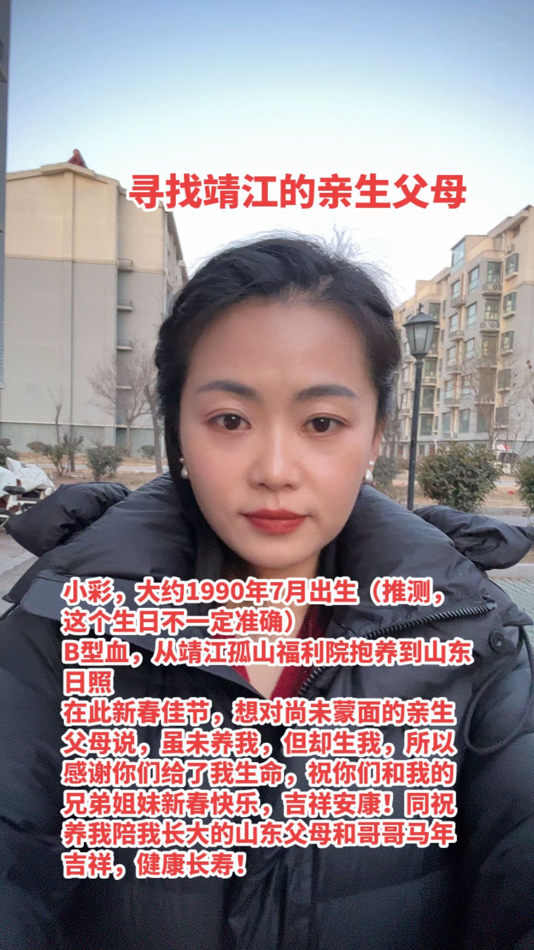 小彩,大约1990年7月出生(推测,这个生日不一定准确)B型血,从靖江孤山福利院抱养到山东日照在此新春佳节,想对尚未蒙面的亲生父母说,虽未养我,但却生我,所以感谢你们给了我生命,祝你们和我的兄弟姐妹新春快乐,吉祥安康!同祝养我陪我长大的山东父母和哥哥马年吉祥,健康长寿!