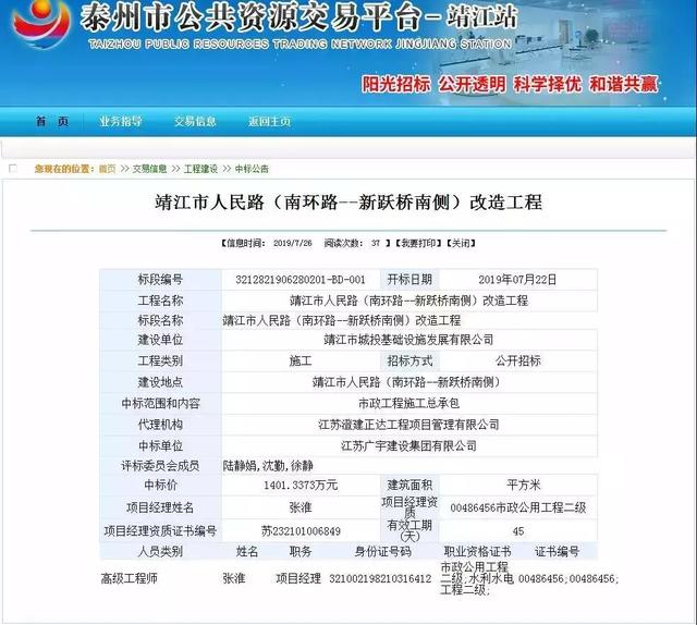 7月26日,泰州市公共资源交易平台发布了人民路(南环路——新跃桥南侧)改造工程中标公告。
